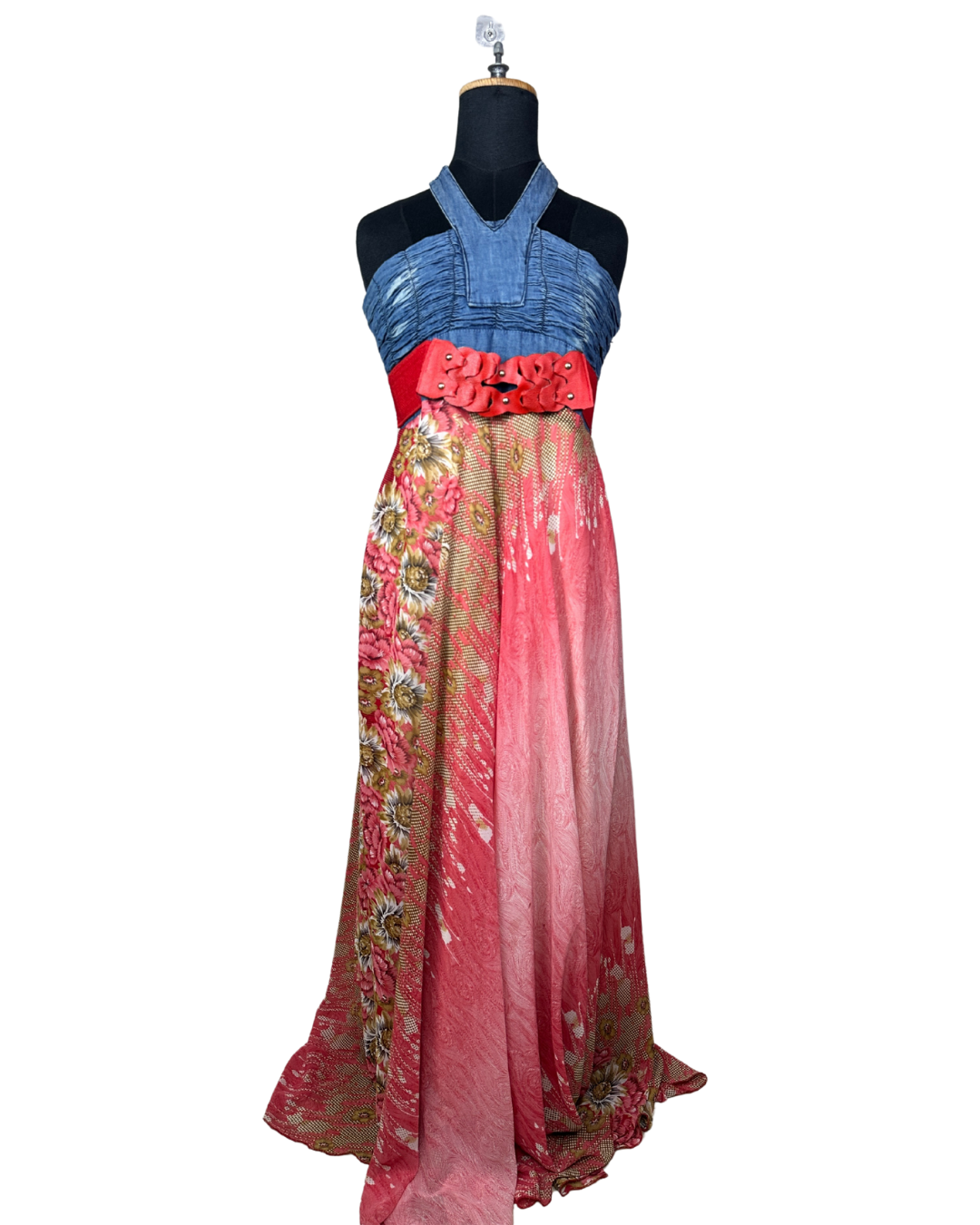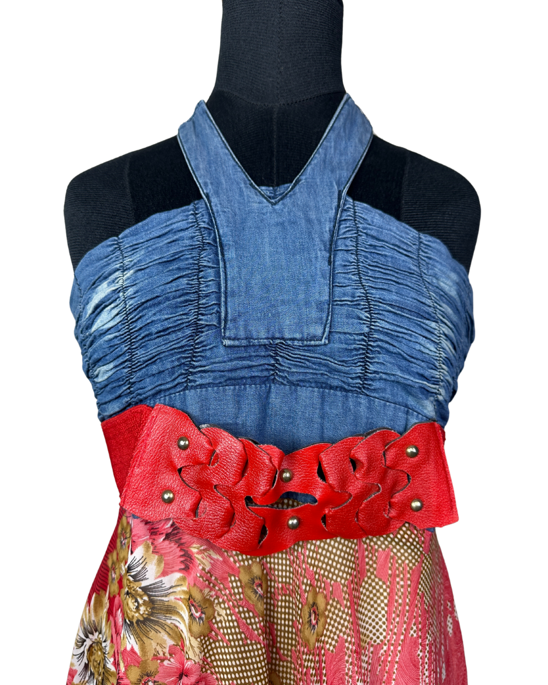 00s Y2K Halter Maxi Dress with Denim Bodice & Red Leather Belt Detail