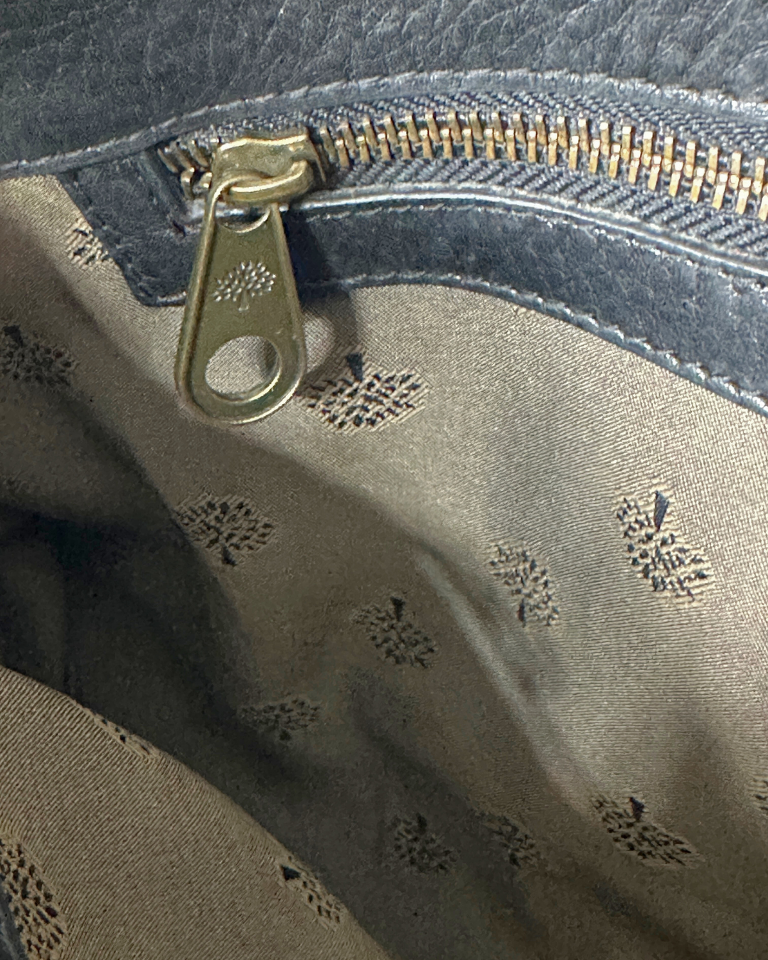 Authentic Mulberry Roxanne bag in soft-grain black leather featuring the brand’s classic brass postman’s locks and signature tree logo hardware. Designed with two front zip pockets, top handles, and a spacious interior lined with Mulberry’s monogrammed fabric.