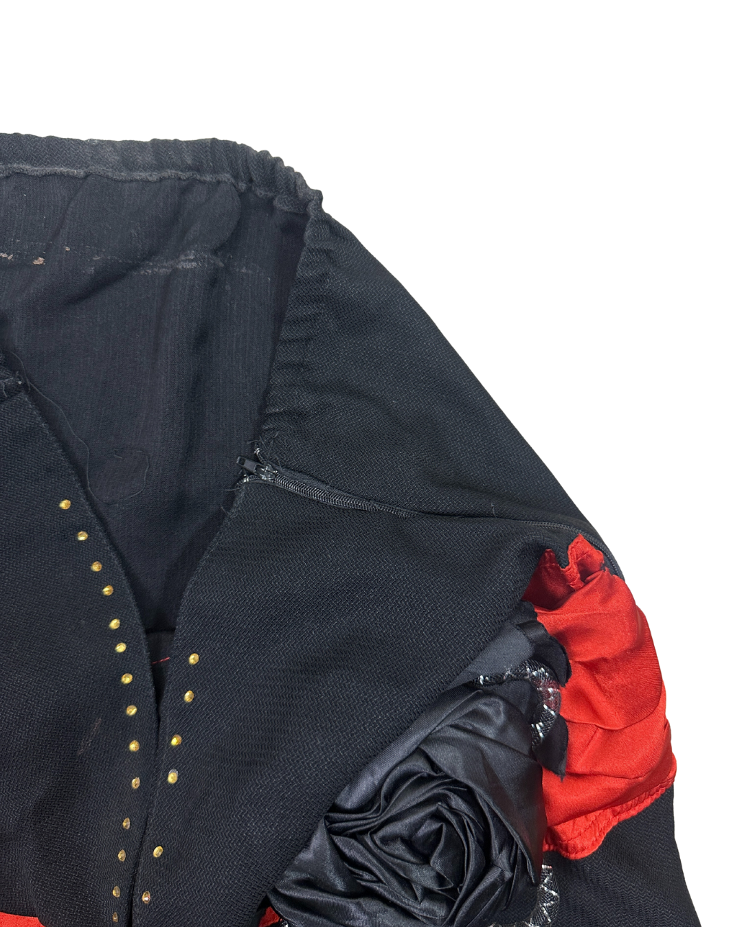 This striking 80s vintage dress brings a dramatic Gothic edge to a classic silhouette, featuring a deep black body and a blood-red rose that’s perfect for a Vampy or dark alternative look.