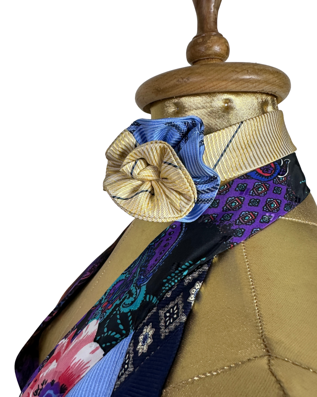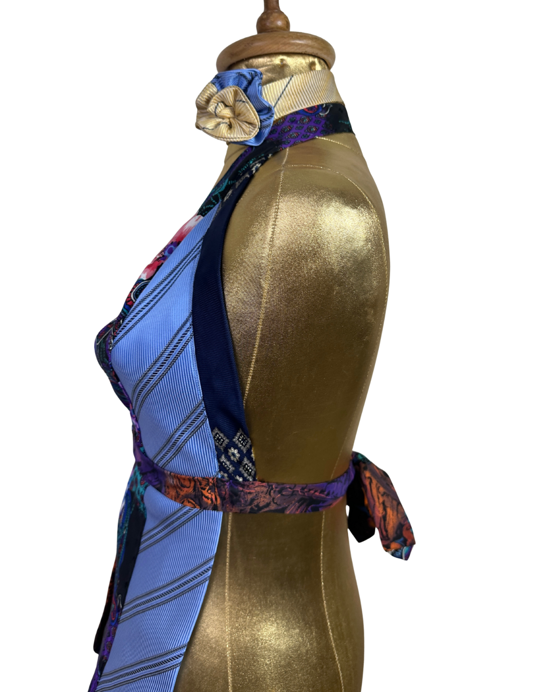 This one-of-a-kind halter vest top is part of our upcycled ReTied Collection, handmade from vintage neckties with a vibrant mix in sky blue, violet, and champagne tones featuring striped, floral, and paisley patterns. Designed with a deep V-cut front and fitted panels, it creates a flattering structured silhouette. It comes with a choker with a matching flower detail. A back tie closure makes it adjustable and comfortable to wear.