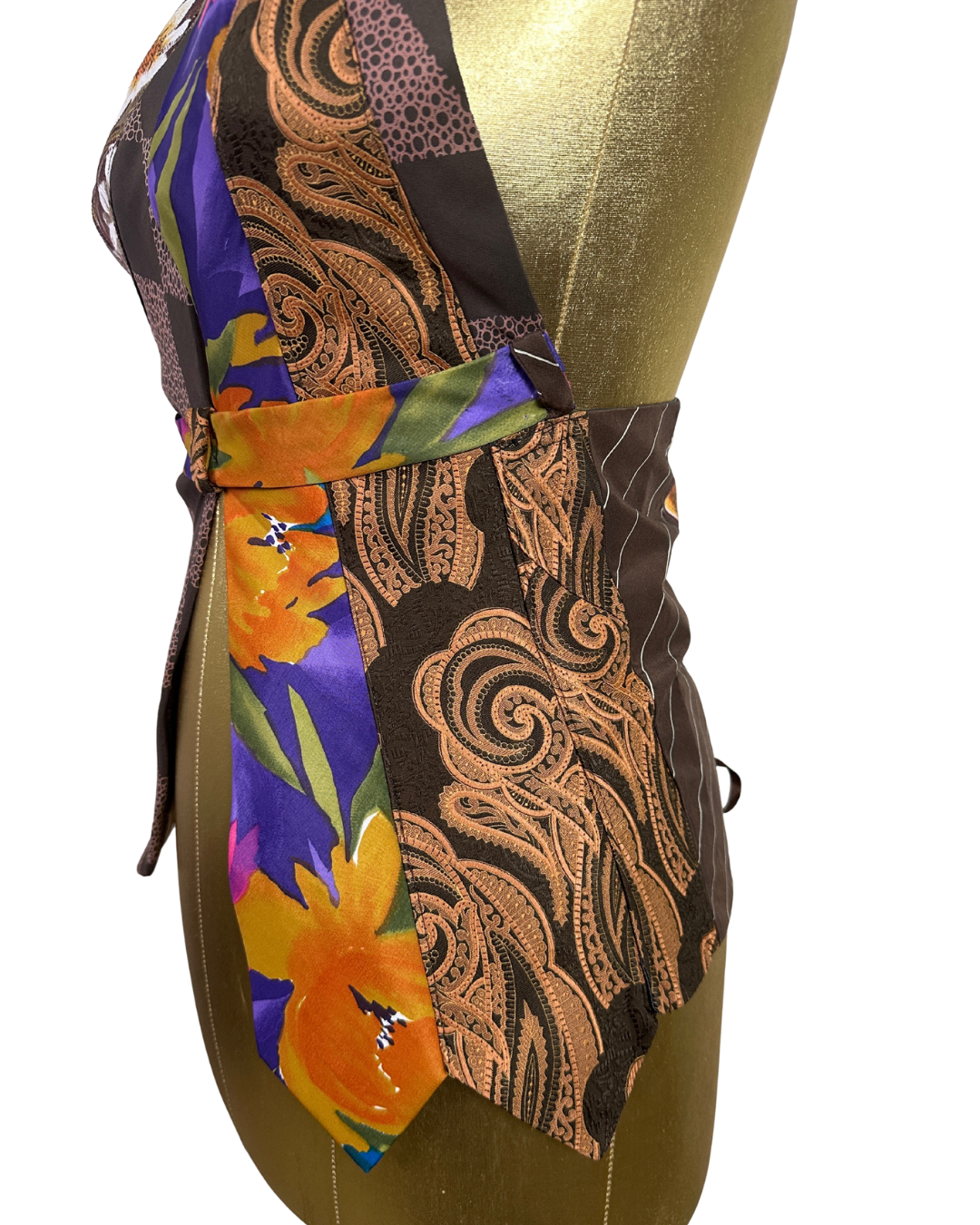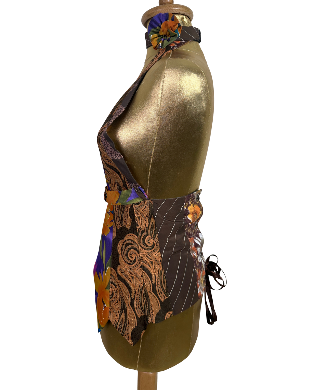 This one-of-a-kind upcycled corset vest-style top is part of our ReTied Collection and handmade from vintage ties in shades of orange, brown and patterned florals. The design features a plunging V neckline and comes with a separate choker finished with a matching statement flower detail. Corset lace-up back allow for a fully adjustable fit.