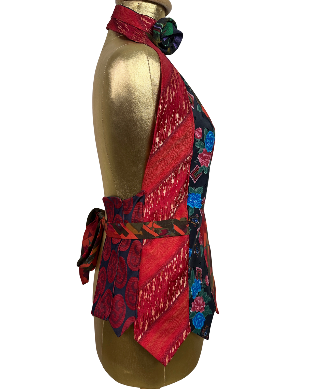 This one-of-a-kind halter vest top is part of our upcycled ReTied Collection and handmade from vintage neckties in red, blue and violet floral patterns. Designed with a deep V-cut front and fitted panels, it’s secured at the waist with a decorative silver-tone clasp closure. Comes with a matching choker featuring a handmade fabric flower detail. A back tie closure makes it adjustable and comfortable to wear.