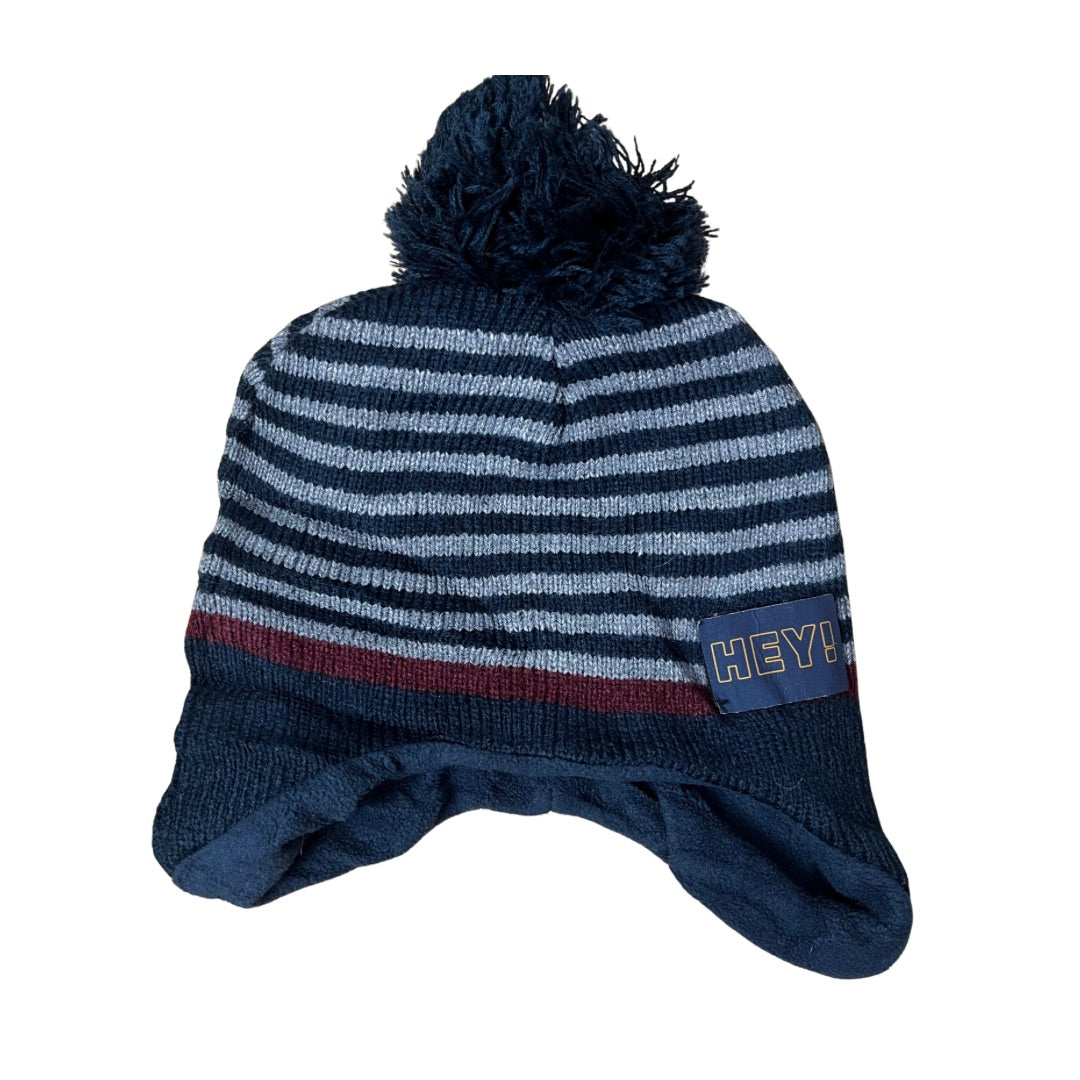 Navy knit earflap beanie with grey stripes, a soft pom-pom on top, and a bold “HEY!” patch detail. Features a warm fleece lining and ear coverage.