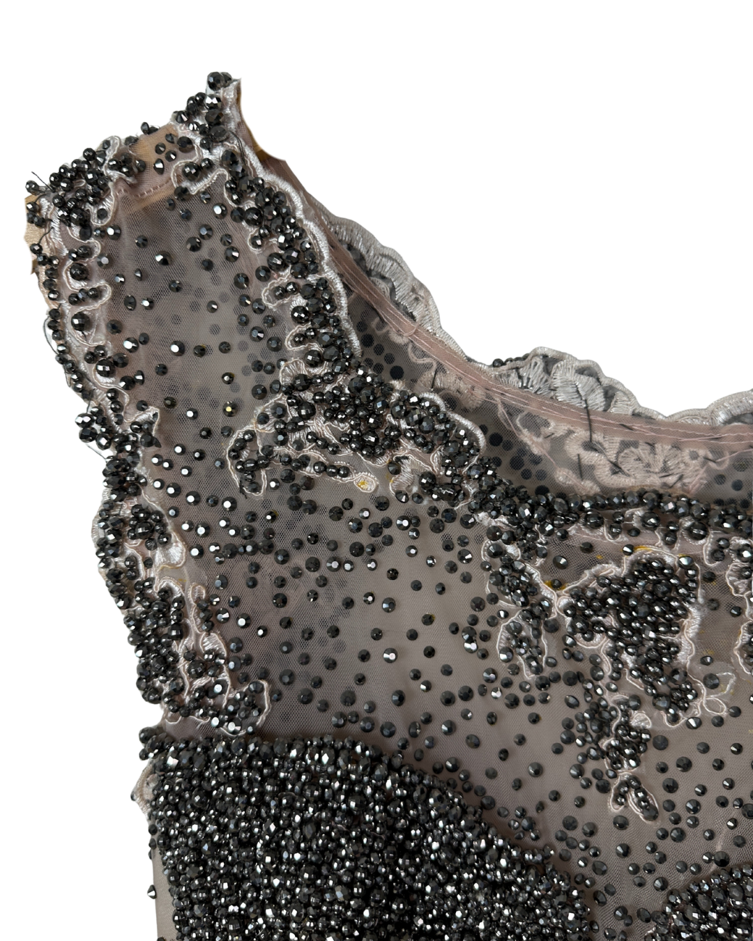A show-stopping pink evening gown featuring a sheer mesh bodice hand-embellished with black beads for a sculpted, dramatic look. The full-length skirt flows softly with layered mesh, creating elegant movement. The back reveals a sheer design with built-in padded support for structure and comfort