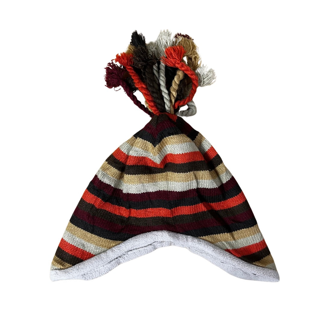 Cozy vintage-style beanie with playful pom-poms and bold stripes.