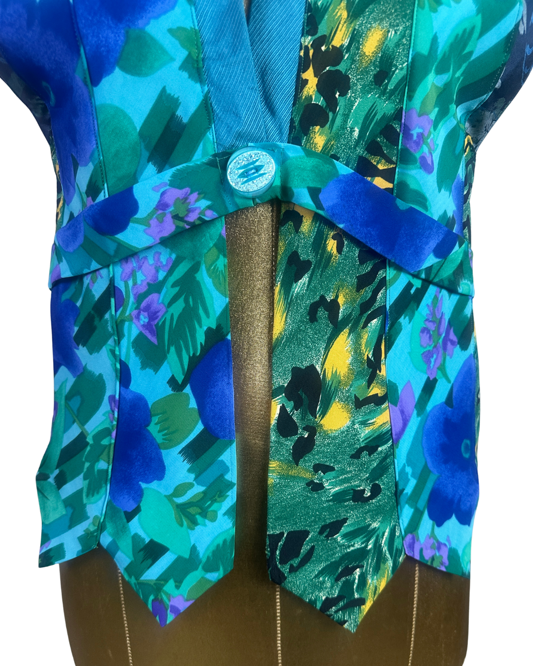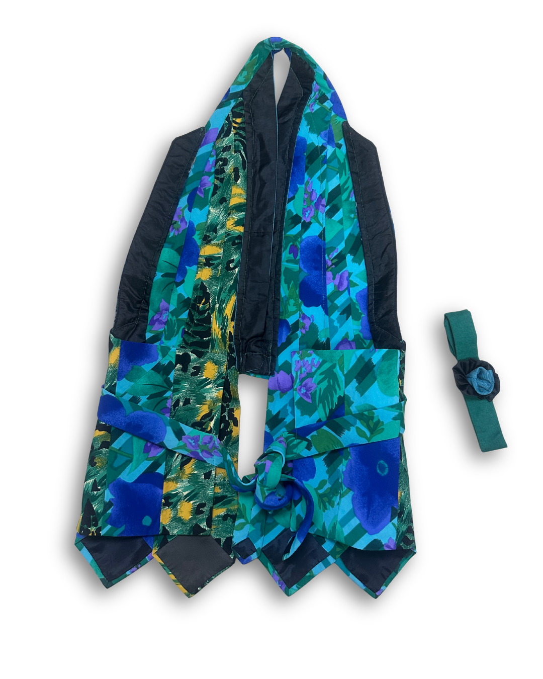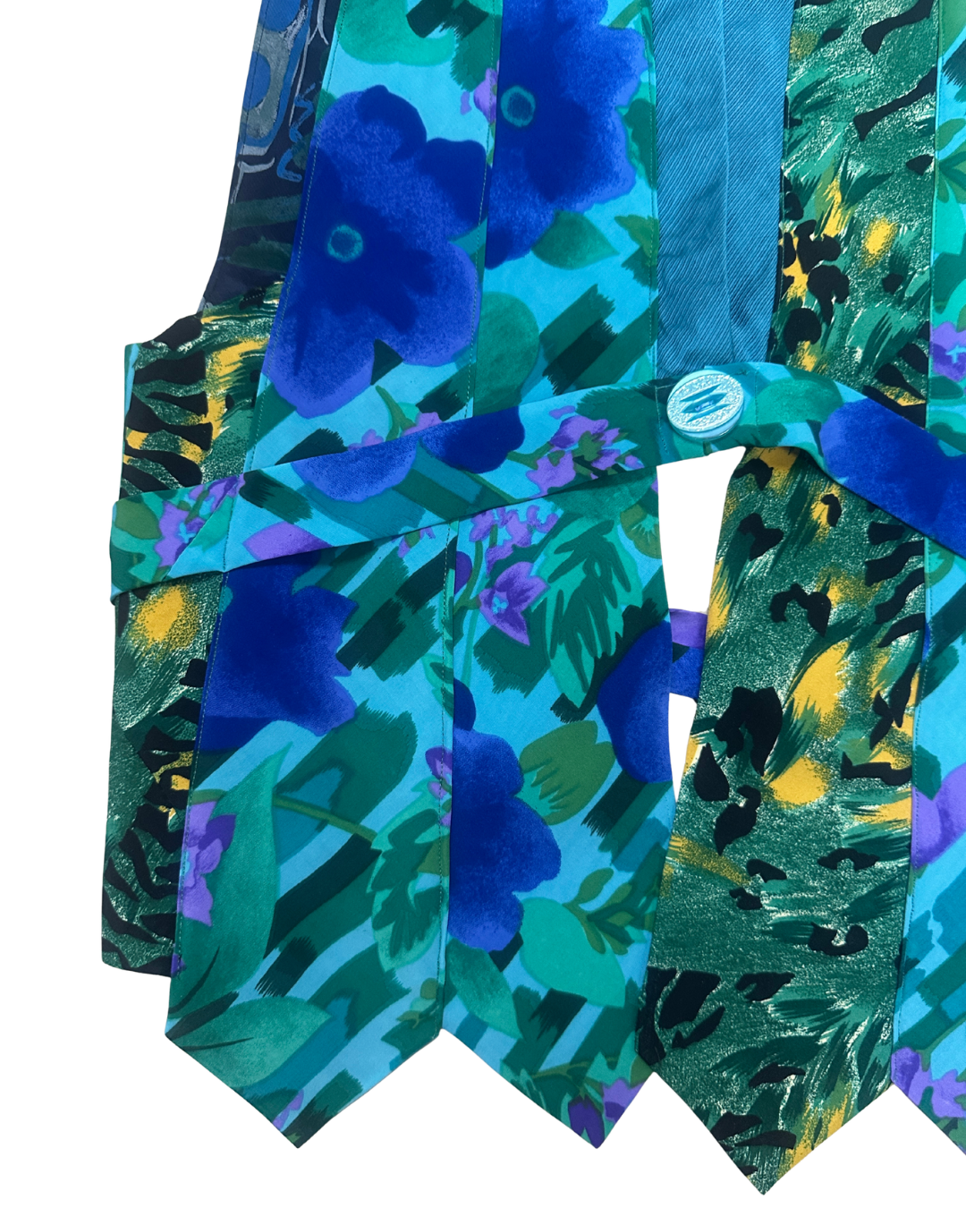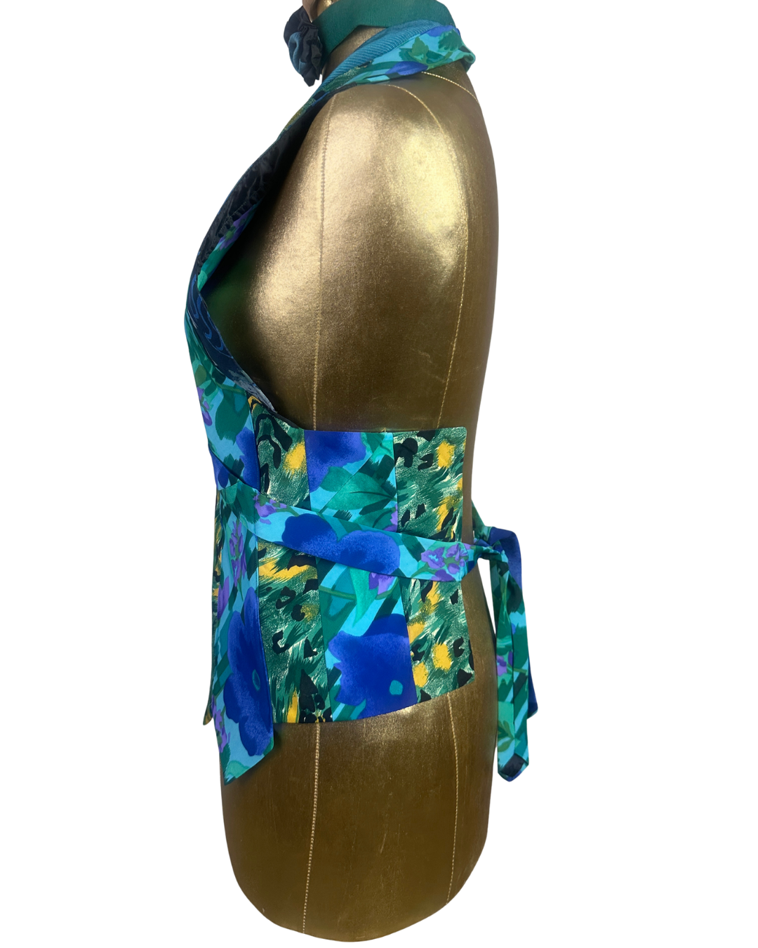 This one-of-a-kind halter vest top is part of our upcycled ReTied Collection and handmade from vintage neckties. Designed with a deep V-cut front and fitted panels, it’s secured at the waist with a decorative button. Comes with a matching choker featuring a handmade fabric flower detail. A back tie closure makes it adjustable and comfortable to wear.