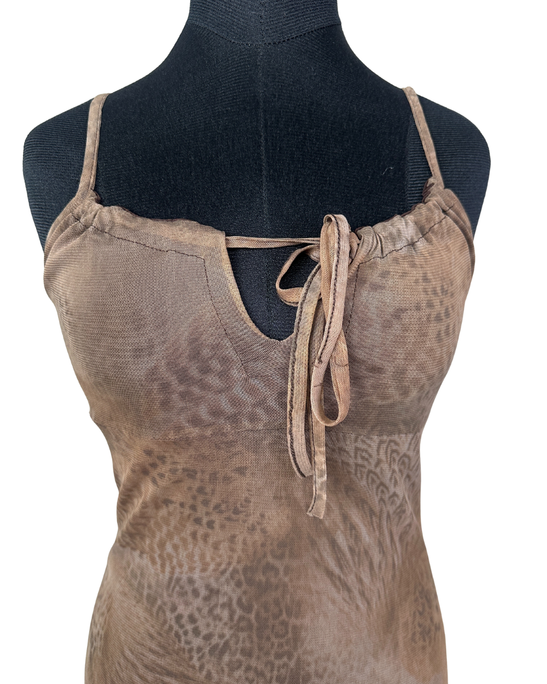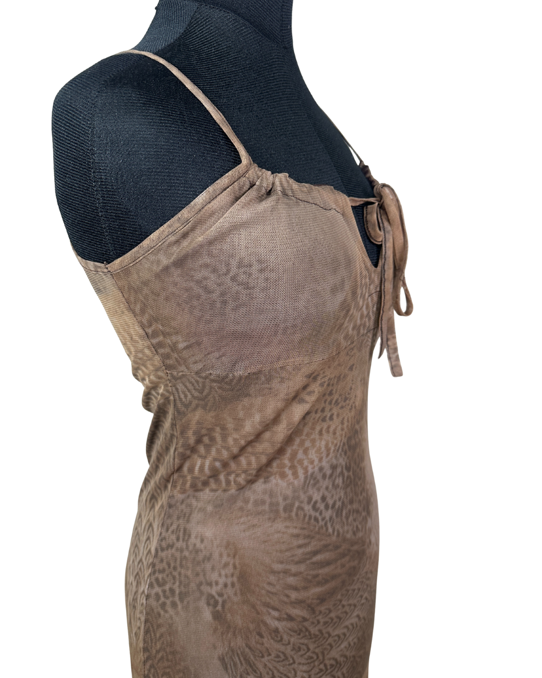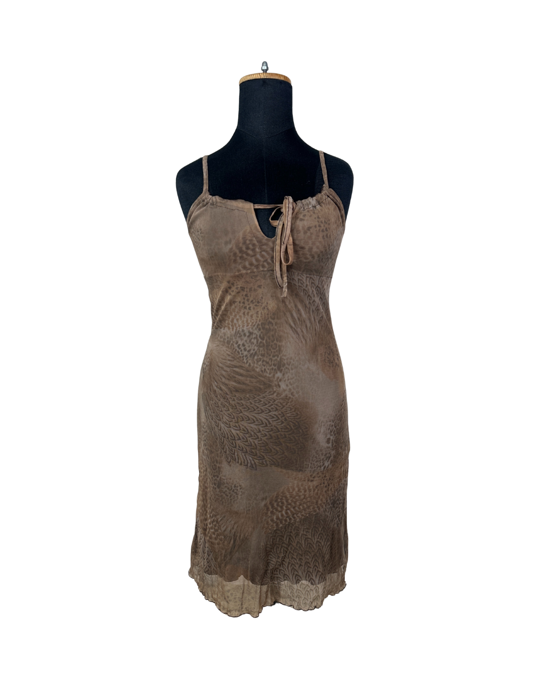 Y2K Feather Print Mesh Dress with Lettuce Hem - Small
